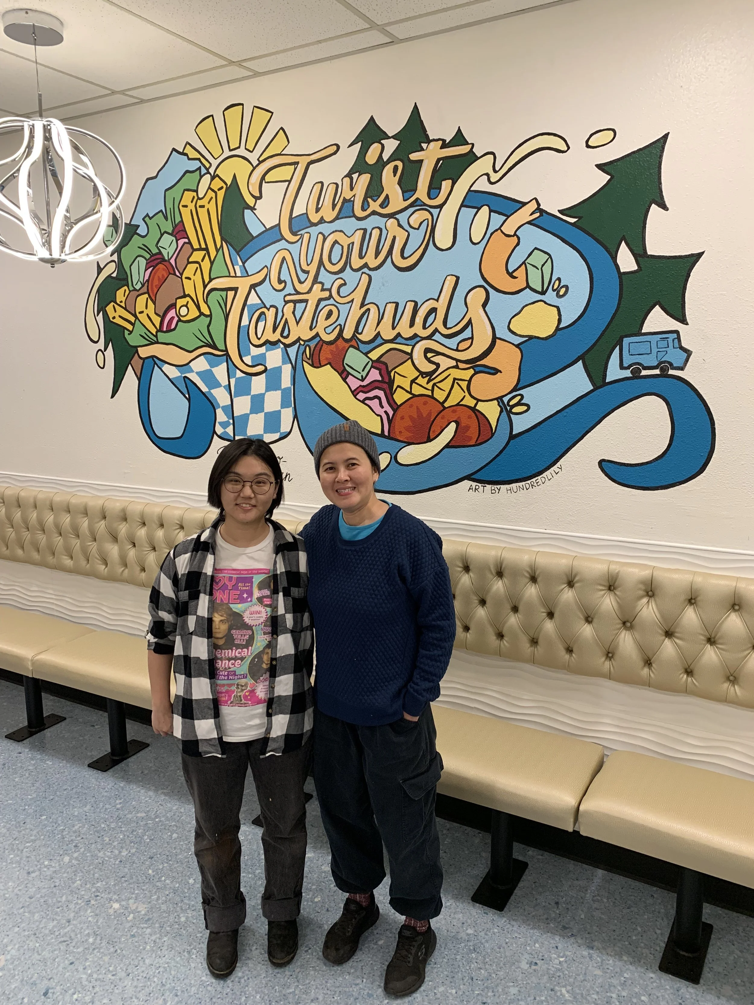 A month before their opening day in December 2023, Twisted Gyros owners Jason and Widi Kupper asked if I would install a mural feature in their new brick-and-mortar restaurant. I was delighted to work with them, and together we created something that takes the joy and vibrance of the food and showcases it in form and color. The client requested a design that highlighted their tagline, “Twist Your Tastebuds,” featured their food and ingredients, and incorporated dynamic movement in the composition.